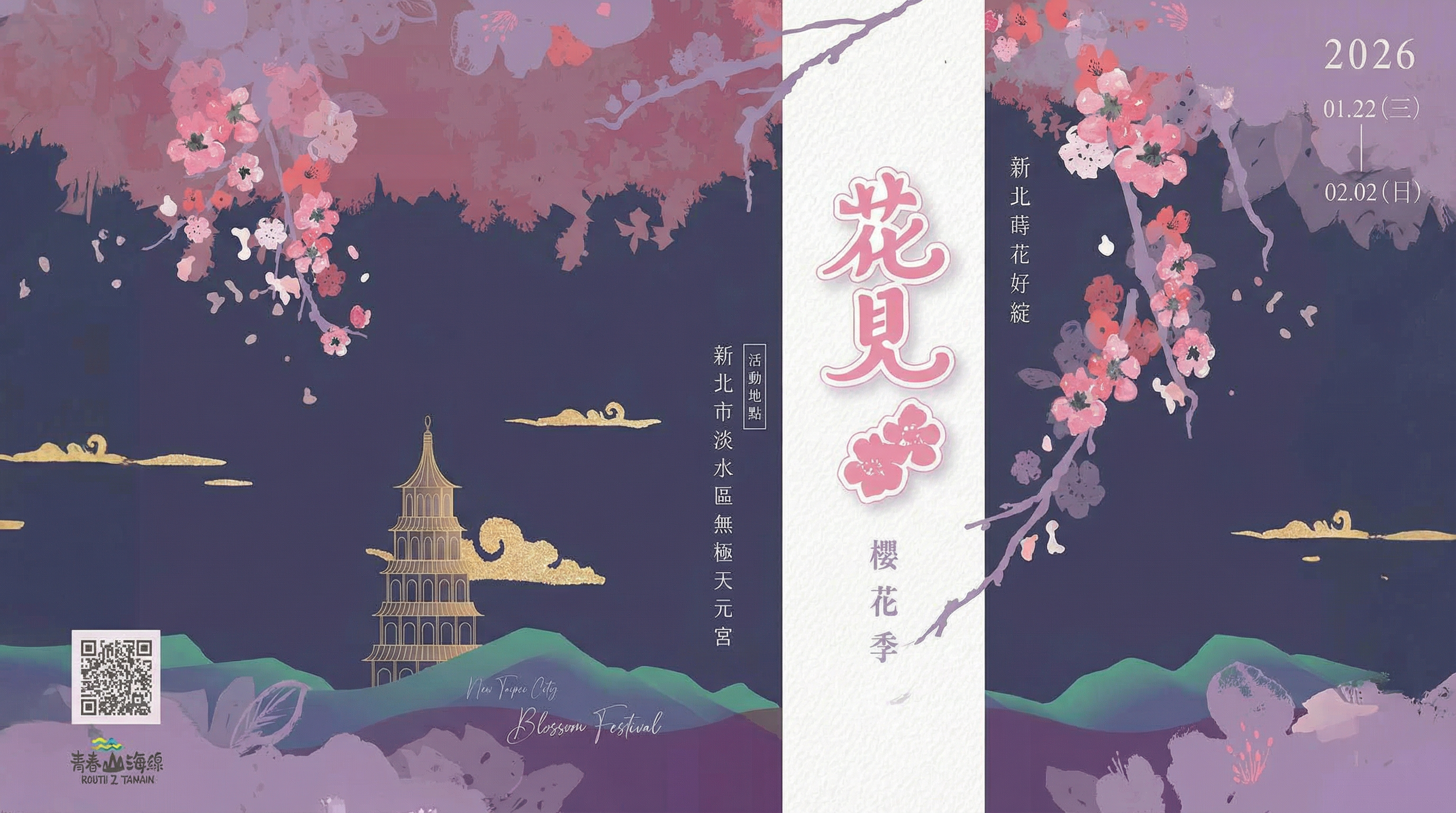 新北市景觀處於114年1月22日至2月2日於淡水無極天元宮辦理「2026花見櫻花季」夜間賞櫻與相關配套活動,歡迎大家來賞櫻,白天夜晚都美麗。